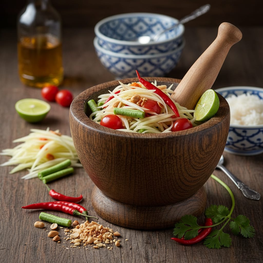 ส้มตำไทยรสชาติแบบตำรับดั้งเดิม รสเผ็ดเปรี้ยวหวานสมดุล