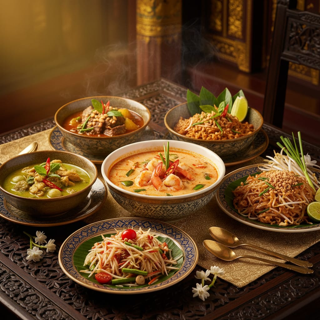 รวม 5 เมนูอาหารไทยยอดนิยมที่ต้องลอง พร้อมรีวิวรสชาติแบบละเอียด ตั้งแต่ต้มยำกุ้ง ผัดไทย แกงเขียวหวาน ส้มตำ และแกงมัสมัน